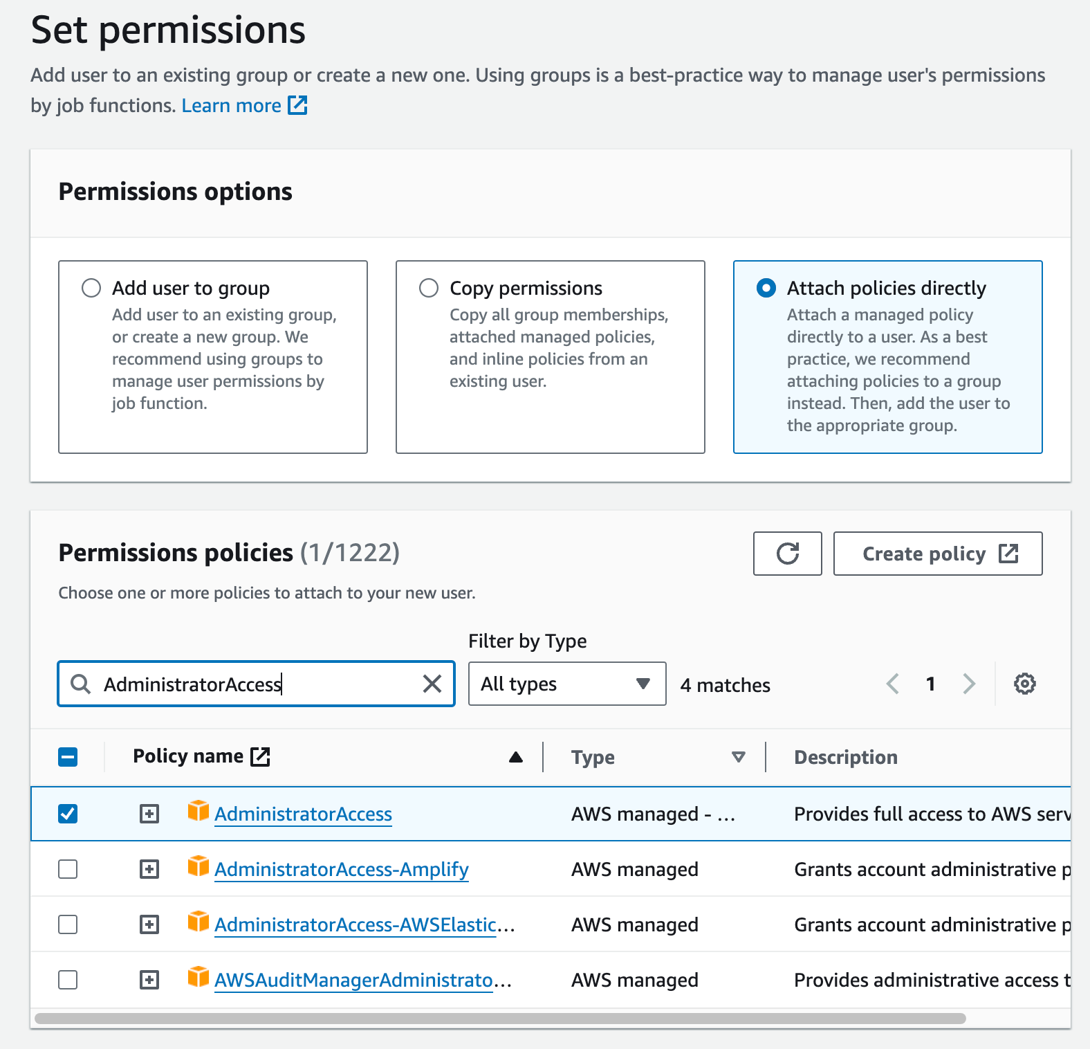 Search for and select “AdministratorAccess”.